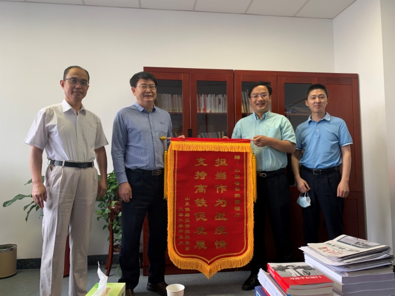 6月9日,集团副总经理唐传营带队向省自然资源厅赠送了“担当作为战疫情,支持高铁促发展”的锦旗,感谢省自然资源厅在疫情期间对莱荣铁路、潍烟铁路用地预审等工作给予的大力支持。