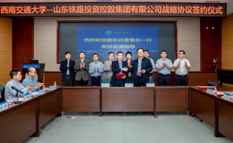在西南交通大学,校长杨丹对姜长兴一行表示欢迎,对双方开展战略合作给予充分肯定,并希望在科技成果转化、人才培养等方面开展深度合作。科研院副院长、川藏办副主任王鹰教授介绍了学校情况和科研工作情况,产业处、土木工程学院、电气工程学院、牵引动力国家重点实验室、交通运输物流学院、交大设计院、唐源电气、运达科技、铁发公司等负责人分别介绍了情况,并就双方可能合作的领域进行了交流,在科技成果产业化、产业合作等方面形成了共识。姜长兴在讲话中指出,与西南交大开展战略合作协议,是双方落实习近平总书记科技强国、交通强国重要论述的具体行动。西南交大技术底蕴厚、创新能力强、科技转化率高,很多新技术、新材料业内领先。山东铁投拥有庞大的铁路建设市场,愿意成为西南交大的“露天实验室”,双方合作大有可为。会上,姜长兴同志、杨丹同志分别代表双方签订战略合作协议,并向何川、杨荣山等五位专家颁发聘书。
