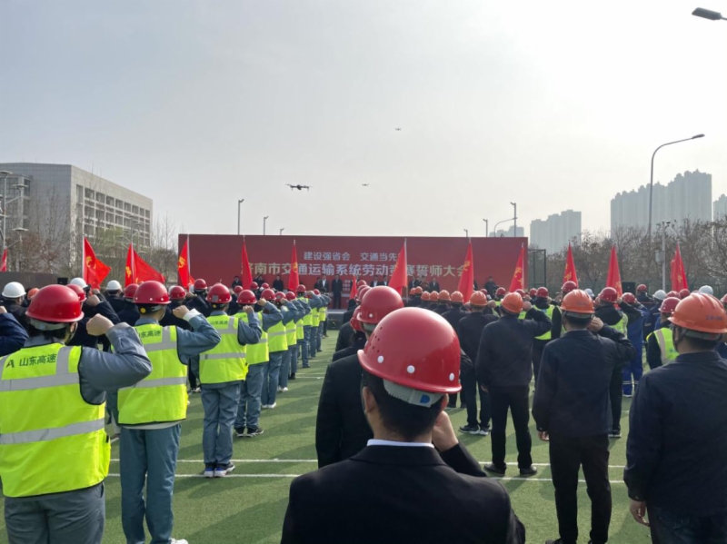 3月14日上午,济南市交通运输系统“建设强省会 交通当先锋”劳动竞赛誓师大会在腊山河西路北延工程现场举行。副市长王京文出席大会并宣布竞赛启动,市城乡交通运输局党组书记、局长贾玉良主持大会。集团工会主席张庆星率领集团党员突击队参加大会。大会向山东铁投集团党员突击队、山东高速集团党员突击队、机场工程建设党员突击队、轨道交通集团党员突击队等12支队伍授旗。