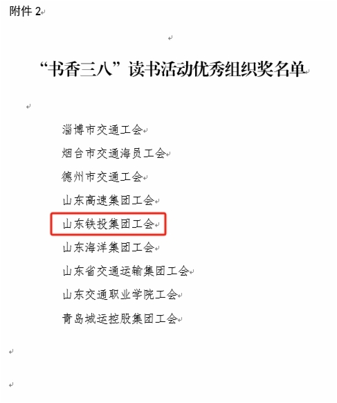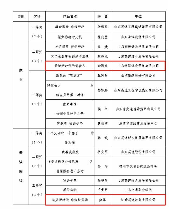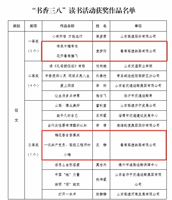在“书香三八”读书活动评选中,鲁南公司袁梦阳同志《传承巾帼奇志花开鲁南腾飞》荣获征文类一等奖;鲁南公司王静同志《梅花香自苦寒来--记共产党员、高级工程师时小梅 》荣获征文类三等奖;综合开发公司李雅坤同志《争做新时代的筑梦人》荣获家书类二等奖;济青公司集体创作《追梦新时代 巾帼绽芳华》荣获表演阅读类三等奖。