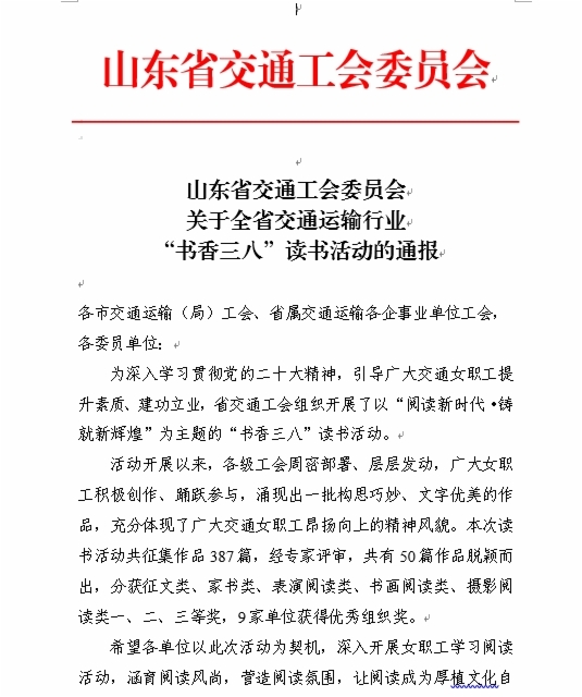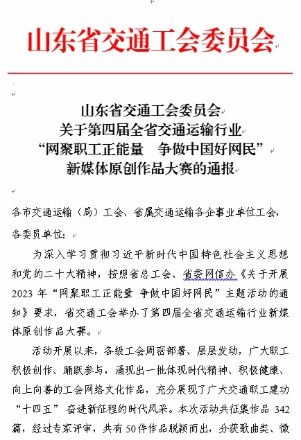 近日,由山东省交通工会举办的“网聚职工正能量 争做中国好网民”新媒体原创作品大赛和“书香三八”读书活动评选结果揭晓。集团工会选送的11个作品获奖,集团工会荣获两个活动优秀组织奖,受到省交通工会通报表扬。