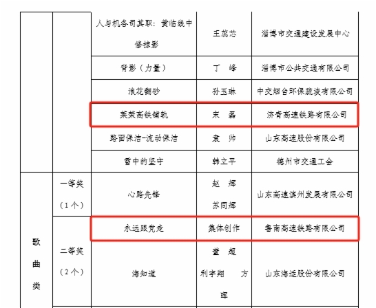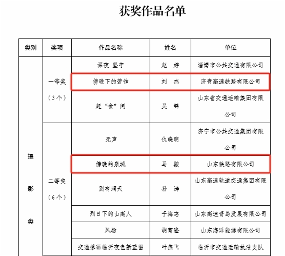 在“网聚职工正能量 争做中国好网民”新媒体原创作品评选中,济青公司刘杰同志《傍晚下的劳作》荣获摄影类一等奖;铁路公司马骏同志《傍晚的泉城》荣获摄影类二等奖;济青公司宋磊同志《莱荣高铁铺轨》荣获摄影类三等奖;鲁南公司集体创作《永远跟党走》荣获歌曲类二等奖;鲁南公司董星辰同志《我是第一书记》荣获微视频类三等奖;基金公司集体创作《破圈》荣获诵读类二等奖;铁路公司沈宝友同志《你的飞奔之美不亚于世界冠军》荣获网评文章类二等奖。