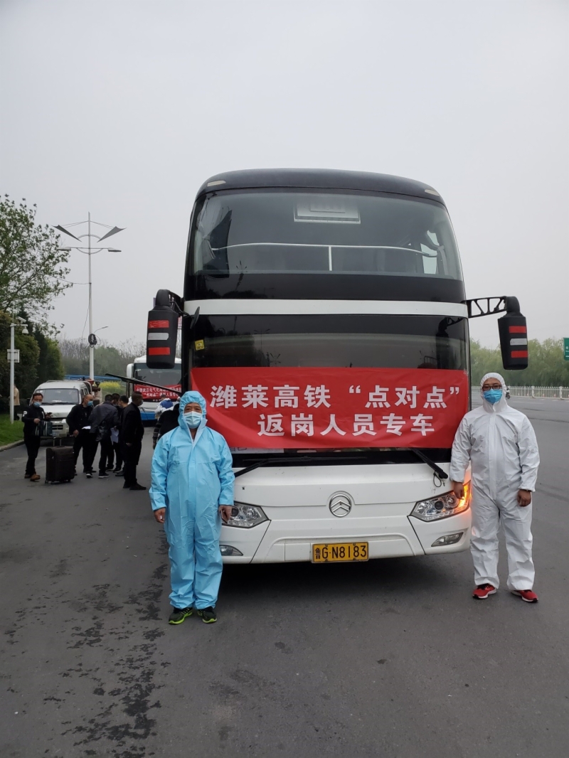 随着疫情防控形势不断好转,潍莱高铁复工复产速度加快。在济青高铁公司协调下,承担潍莱高铁四电工程的中铁武汉电气化局集团潍莱高铁项目部,主动与潍坊市政府、应急办、防疫办、交通局等相关职能部门沟通,开出了首趟复工复产“点对点一站式”直达大巴车,保障复工人员顺利返岗,解决了企业用工荒,也为地方经济建设复苏注入了“强心剂”,实现了员工、企业、政府的互利多赢。