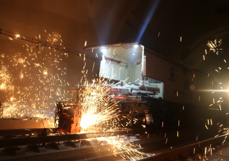经过施工人员对长钢轨焊接头进行除锈、焊接、正火、打磨和探伤等一系列复杂工序后,一根根500米长钢轨经过单元焊接变为1.5公里的单元轨,再经过锁定焊及应力放散施工变成无缝线路,不断向前延伸。