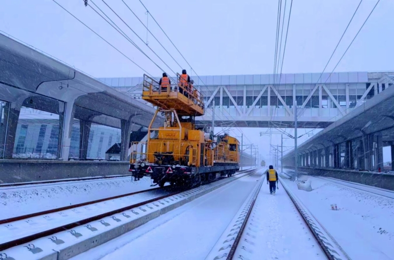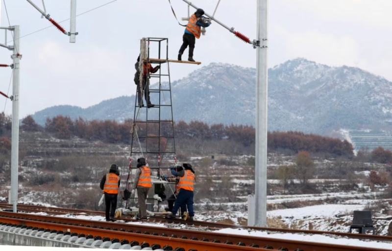 近日,在潍烟高铁蓬莱至芝罘段四电工程施工现场,随处都能见到现场作业人员战风雪、斗严寒紧张有序的工作场景:冒雪进行站线接触网导线架设、顶风进行接触网悬挂参数测量、进行电力变电专业单体调试、室内设备配线调试安装……虽是寒冬,作业现场依然如火如荼。
